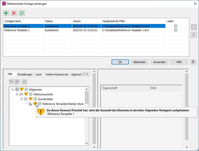 Wenn Sie eine weitere Vorlage anhängen und Duplikate erkannt werden, werden Komponenten mit Konflikten mit Warnsymbolen und QuickInfos gekennzeichnet.