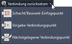 Klicken Sie in der kontextabhängigen Multifunktionsleisten-Registerkarte Kanalnetze auf Gruppe Ändern Dropdown-Liste Verbindung zurücksetzenSchacht/Bauwerk-EinfügepunktFinden.