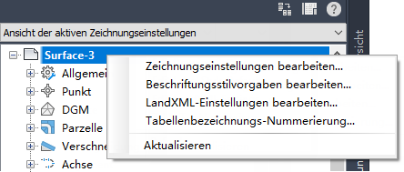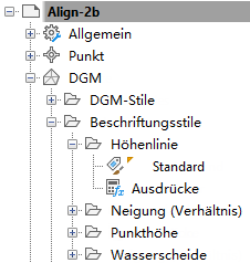 Bearbeiten Sie die Beschriftungseinstellungen auf der Zeichnungsebene, Objektebene (z. B. DGM) und auf der Ebene des Beschriftungsstils (z. B. Höhenlinien).