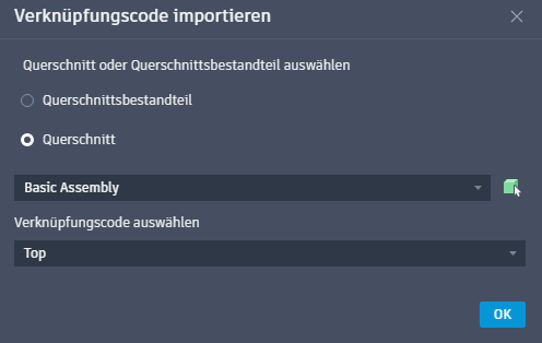 klicken, um in der Zeichnung manuell ein Querschnittsbestandteil oder eine Baugruppe auszuwählen. Geben Sie nach der Auswahl einen Verknüpfungscode aus der Dropdown-Liste an.