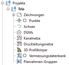 Ein Projekt enthält Sammlungen von Projektobjekten, darunter DGMs, Achsen, Längsschnitte, Kanalnetze, Druckleitungsnetze und Planrahmen-Gruppen, die mit anderen Benutzern gemeinsam verwendet werden können. Alle gemeinsamen Objekte werden in den Projektobjektsammlungen in der Übersichtsstruktur aufgelistet. Projektmitglieder können eine schreibgeschützte Kopie eines Projektobjekts, eine so genannte Referenz, in der Zeichnung erstellen. Mit dieser schreibgeschützten Kopie der Geometrie des Projektobjekts können Sie Beschriftungs-, Entwurfs-, Analyse- oder Was-wäre-wenn-Aufgaben durchführen.