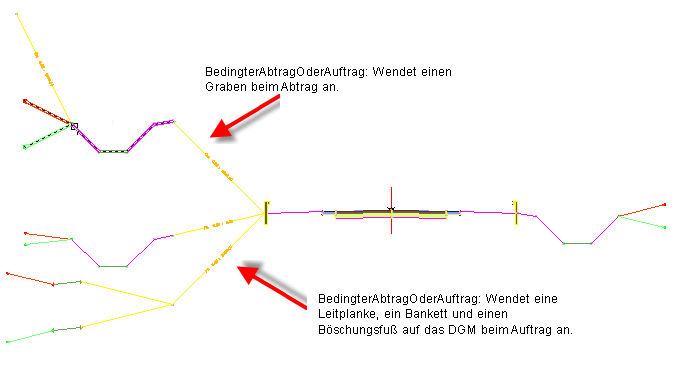 Ein bedingter 3D-Profilkörperquerschnitt kann z. B. zwei BedingterAbtragOderAuftrag-Querschnittsbestandteile enthalten. Der erste BedingterAbtragOderAuftrag-Querschnittsbestandteil kann so konfiguriert werden, dass ein Graben-Querschnittsbestandteil angewendet wird, wenn eine Abtragsbedingung vorhanden ist. Der zweite BedingterAbtragOderAuftrag-Querschnittsbestandteil kann so konfiguriert werden, dass eine Leitplanke, ein Bankett und ein Böschungsfuß auf ein DGM angewendet werden, wenn eine Auftragsbedingung vorhanden ist. Mit Bedingt-Querschnittsbestandteilen können Sie die Anzahl von 3D-Profilkörperbereichen und Querschnitten reduzieren, die Sie beibehalten müssen.