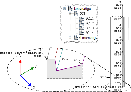 Punkt 101: BC1 ist der Linienelementname, " " (Leerzeichen) ist das Element-/Codetrennzeichen, B ist der Code für <Anfangen>, STD ist der Code für <horizontaler Versatz>, -4 ist der Wert für den ersten horizontalen Versatz, V ist der Code für <vertikaler Versatz>, .1 ist der erste vertikale Versatzwert usw. für jede der bleibenden 3 Versätze. Punkte 112, 123, 134, 145 und 156: BC1-Linienzug mit aktuellen Versätzen werden fortgesetzt. Punkt 167: BC1 wird fortgesetzt, aber die versetzten Linienzüge werden durch den SO-Code <Versätze stoppen> beendet. Punkt 178: BC1 wird fortgesetzt. Ein Wert muss dem Code für den horizontalen Versatz folgen. Ein negativer Wert versetzt den aktiven Linienzug nach links, und ein positiver Wert versetzt den aktiven Linienzug nach rechts. Es können mehrere Versätze verwendet werden, aber wenn nachfolgende horizontalen oder vertikale Übergänge gemacht werden, müssen alle vorherigen horizontalen oder vertikalen Versatzcodes für jeden Versatz angegeben werden. |
