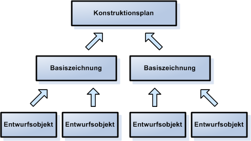 Bei allen Projektstrukturen hat es sich bewährt, einzelne Entwurfsobjekte, wie etwa Achsen und DGMs, in getrennten Zeichnungen zu organisieren. Diese Objekte werden während des Entwurfsprozesses in Basiszeichnungen referenziert. Fertiggestellte Konstruktionspläne und Produktionszeichnungen enthalten eine Kombination aus Objekt- und Zeichnungsreferenzen.