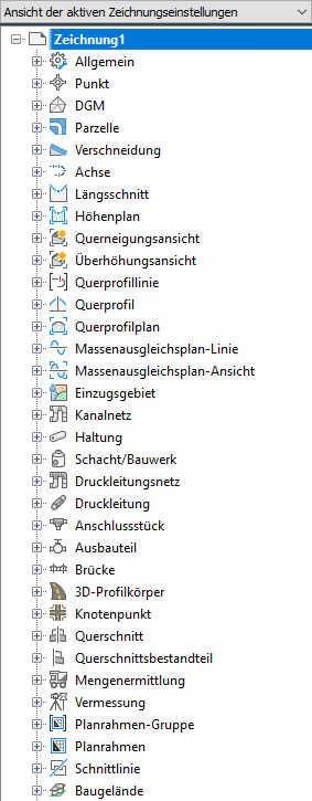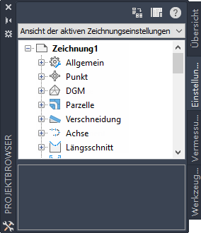 Auf der Registerkarte Einstellungen können Sie Stile für Autodesk Civil 3D-Objekte verwalten und Einstellungen für Zeichnungen und Befehle steuern.