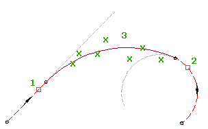Sie können dieses Objekt zwischen zwei Linien, zwei Bogen oder zwischen einer Linie und einem Bogen hinzufügen. Die Zuordnungsobjekte (1, 2) und der Zwangspunkt (3) bestimmen den Bogenradius und die Bogenlänge. Sie können den Radius und die Länge für diesen Bogentyp nicht bearbeiten.