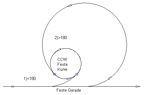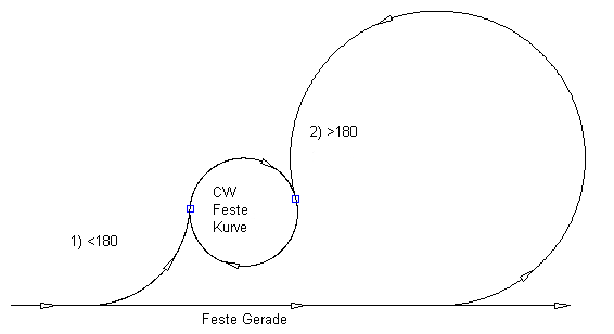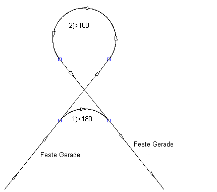 Die folgende Abbildung zeigt eine Ausrundung als Pufferelement zwischen zwei Geraden-Festelementen. Es gibt zwei Lösungen, die auf dem eingeschlossenen Bogenwinkel basieren: