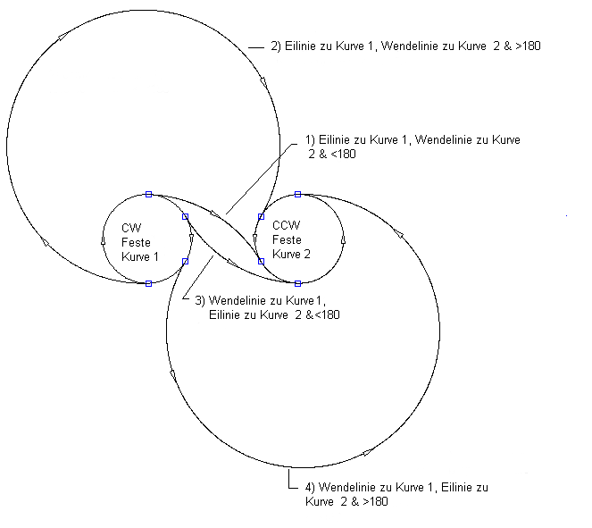 Die folgende Abbildung zeigt eine Ausrundung als Pufferelement zwischen einer Geraden und einem Bogen im Uhrzeigersinn (links) mit einem vorgegebenen Radius:
