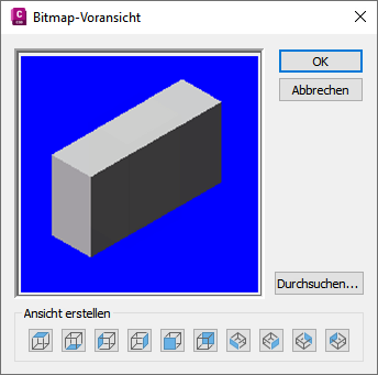 Befolgen Sie die nachstehende Vorgehensweise, um ein Vorschaubild der Komponente zu generieren, das Sie bei der Komponentenauswahl unterstützt. Der Komponenten-Builder generiert das Vorschaubild auf Basis einer festgelegten Ansichtsdarstellung. Sie haben bei der Anzeige des Modells die Wahl zwischen den zehn standardmäßigen AutoCAD-Ansichtsrichtungen (Oben, Unten, Links, Rechts, Vorne, Hinten, ISO-Ansicht SW, ISO-Ansicht SO, ISO-Ansicht NO und ISO-Ansicht NW).