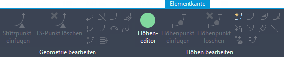 Ist eine Elementkante dynamisch mit einem 3D-Profilkörper verknüpft, sind die meisten Befehle zum Bearbeiten von Elementkanten in der Multifunktionsleiste nicht verfügbar. Die folgende Abbildung zeigt die Gruppen für die Bearbeitung auf der kontextabhängigen Registerkarte der Multifunktionsleiste Elementkante, wenn eine dynamische Elementkante ausgewählt ist. Sie können Daten mit dem Höheneditor oder dem Befehl Schnell-Höhenbearbeitung anzeigen, jedoch nicht bearbeiten.