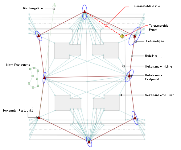 Ein Vermessungsnetzwerk besteht aus einer Reihe miteinander verbundener Linien, die für die beobachteten Instrumentenstandpunkte oder -stationen stehen. Es enthält alle zugeordneten bekannten Festpunkte, bekannten Richtungen, Standpunkte und Beobachtungen.