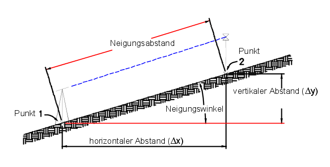 | Punkt 1 und Punkt 2 | Dies sind die zwei vorhandenen Punkte, zwischen denen eine unsichtbare Linie gezogen wird. Anhand dieser Linie wird der Neigungsabstand zwischen den beiden Punkten bestimmt. |