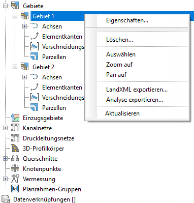 Sie können auf diese Eigenschaften zugreifen, indem Sie mit der rechten Maustaste auf den Knoten der benannten Gebietssammlung (z. B. Gebiet 1) in der Übersichtsstruktur klicken.