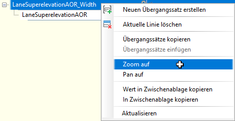 Sie können auch Werte in der Panorama-Ansicht 3D-Profilkörper-Übergang angeben und bearbeiten. Wenn Sie eine Zeile in der Ansicht auswählen, wird der entsprechende Übergangsbereich in der Zeichnung mit blauen Symbolen hervorgehoben.
