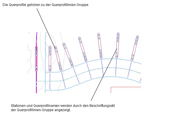 Querprofillinien kreuzen eine Achse in einem angegebenen Abstand nach links und rechts. Normalerweise werden Querprofillinien an bestimmten Stationen entlang einer horizontalen Achse erstellt.