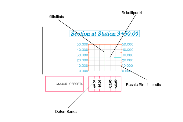 Das Querprofilplan-Objekt zeigt Schnittdaten (sowohl vorhandene als auch Geländeprofile/Entwürfe) entlang einer Querprofillinie an einer bestimmten Station auf einer Achse an. Ein Querprofilplan zeigt ein Querprofil, das entweder aus einem DGM (TIN-DGM oder 3D-Profilkörper-DGM), einem 3D-Profilkörper (bei dem es sich um einen Querschnitt an einer bestimmten Station handelt) oder einem Kanalnetz erstellt wurde. Ferner können Datenbänder über oder unter dem Querprofilplan angezeigt werden.
