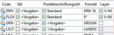 Code-Eigenschaft. Wird beim Abgleich der Beschreibungsschlüssel verwendet. Stimmt der Code beispielsweise mit der Kurzbeschreibung eines Punkts überein, werden die in diesem Beschreibungsschlüssel definierten Eigenschaften auf den Punkt angewandt, sobald dieser in der Zeichnung erstellt wird. Der Beschreibungscode kann bestimmte Zeichen, so genannte Platzhalter, enthalten, mit denen sich der Übereinstimmungsbereich des Beschreibungsschlüssels erweitern lässt.