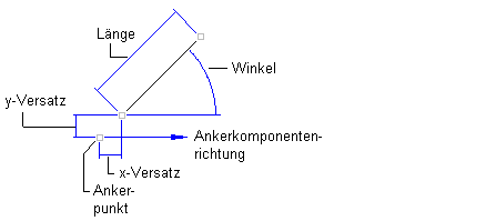 - Anfangspunkt, Länge und Winkel: Bei dieser Methode verankern Sie den Anfangspunkt der Linienkomponente mit der Anschlusskomponente. Geben Sie anschließend die Länge und den Winkel an. Die nachstehende Abbildung zeigt eine Linie, die mit dieser Methode definiert wurde: