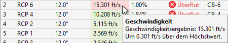 Wenn die Geschwindigkeit unterhalb der minimalen oder oberhalb der maximalen Geschwindigkeit gemäß Angabe in den Einstellungen liegt, wird diese Spalte rot schattiert. Wenn Sie den Cursor über die Zelle bewegen, wird eine QuickInfo angezeigt, die angibt, wie weit sich die Geschwindigkeit unter dem Minimalwert oder über dem Maximalwert befindet.