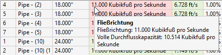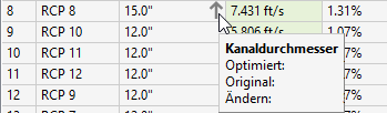 Wenn der Analysetyp Haltungen neu dimensionieren und Sohlen zurücksetzen auf der Seite Allgemein ausgewählt und die Größe eines Haltungsdurchmessers geändert wurde, enthält diese Spalte einen nach oben bzw. nach unten weisenden Pfeil. Beim Platzieren des Cursors über den Pfeil wird eine QuickInfo angezeigt, die erläutert, wie die Größe der Haltung geändert wurde.