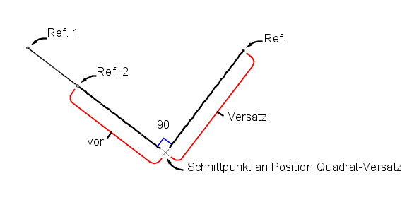 Mit dem Befehl Quadratischer Versatz können Sie den abgehenden Abstand und den Versatzabstand zum Schnittpunkt anzeigen.