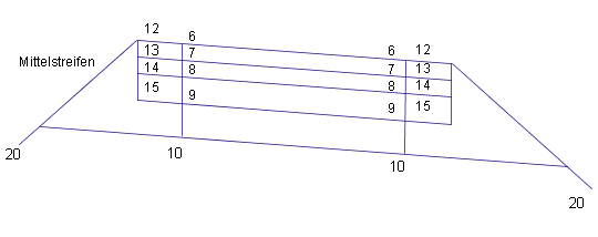 Die folgende Abbildung zeigt die Position der Standard-Verknüpfungscodes bei Querschnittsbestandteilen, die eine baulich getrennte Straße mit abgesenkter Mittellinie und eben abschließenden Banketten definieren.