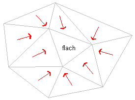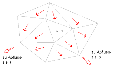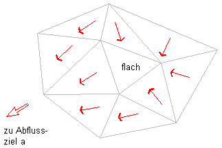 Wenn sich ein Teil der gegenüberliegenden nicht flachen Dreiecke von der Begrenzung der ebenen Fläche aus nach unten neigt, sie alle aber zum gleichen Ablaufzielpunkt fließen, ist die ebene Fläche Teil der Wasserscheide für diesen Ablaufzielpunkt "a" (siehe folgende Abbildung):