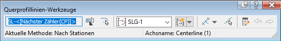 Am unteren Rand des Werkzeugs werden die aktuelle Methode zum Erstellen von Querprofillinien, der mit der Querprofillinie verknüpfte Achsname und der Layer, in dem die Querprofillinie enthalten ist, angezeigt.