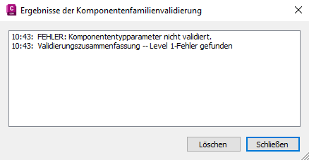 Wenn Ihr Modell Fehler enthält, wird in der Statusleiste angezeigt, dass die Komponentenvalidierung fehlgeschlagen ist, und in einem Dialogfeld werden die Fehler aufgelistet. Überprüfen Sie die Fehler, nehmen Sie die erforderlichen Änderungen vor, und wiederholen Sie diesen Schritt, bis die Validierung erfolgreich ist.