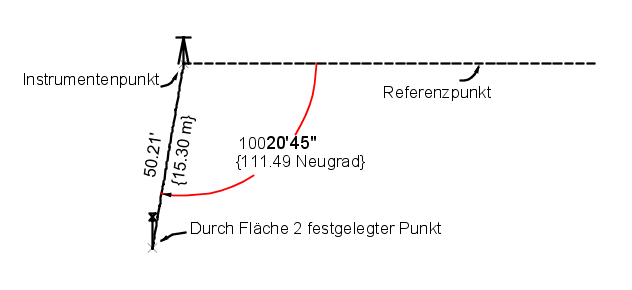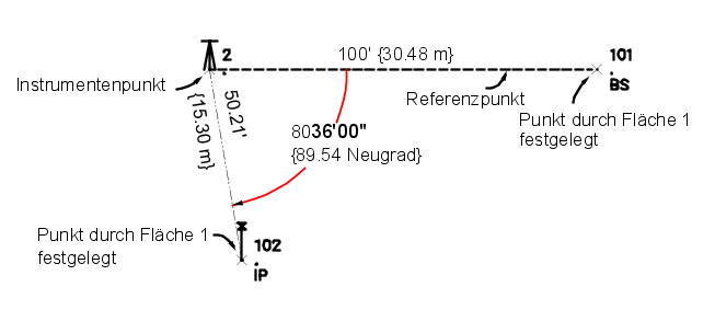 Punkt 101 wird durch eine Rechtsdrehung um einen horizontalen Winkel von 0 von Fläche1 aus und durch Anwendung eines vertikalen Winkels von 100 in einem Abstand von 30.480 vom Instrumentenpunkt mit der Beschreibung BS positioniert.