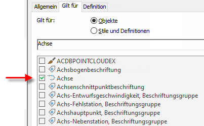 Bei den meisten Beschriftungstypen sollten Sie auf der Registerkarte Anwenden im Stil-Manager den zu beschriftenden Typ von Objekt, nicht den zugehörigen Typ der Beschriftung für das Objekt auswählen (Ausnahmen finden Sie im folgenden Abschnitt). Wählen Sie beispielsweise, um Achsen mit Eigenschaftsdaten zu beschriften, beim Einrichten des Eigenschaftssatzes „Achse“ aus.