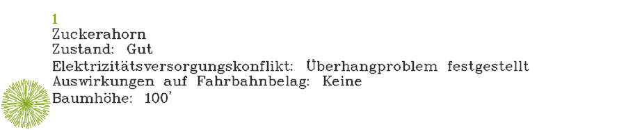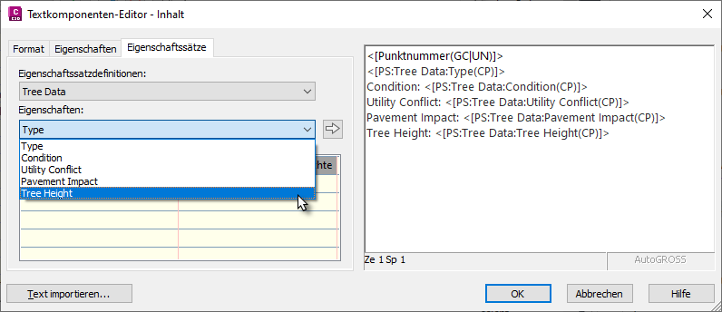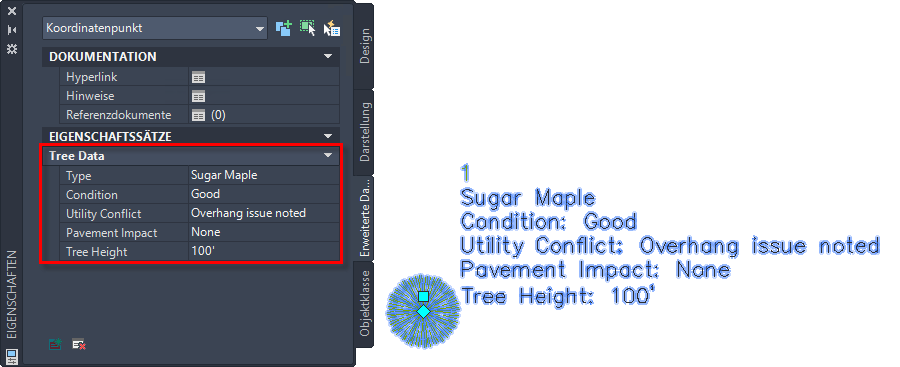 Die folgende Abbildung zeigt einen mit Baumdaten beschrifteten Punkt, der in einem Eigenschaftssatz eingerichtet ist.