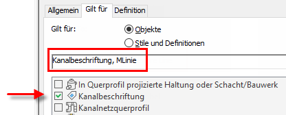 Wenn Sie Eigenschaftssatzdaten in Projektions-Beschriftungsstile einbeziehen möchten, wählen Sie den Objekttyp Beschriftung für Querprofilprojektion zusätzlich zum Objekttyp aus, dessen Projektion im Querprofilplan angezeigt wird.