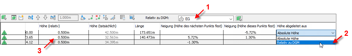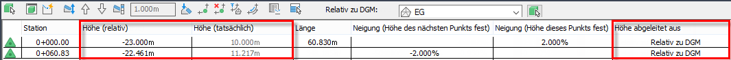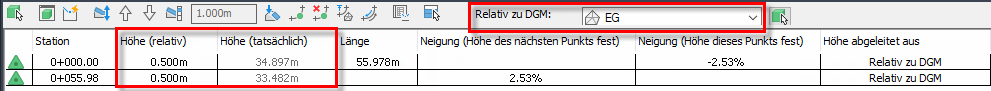 Wenn Sie sie ändern und als relativ zum DGM EG definieren, bleibt die tatsächliche Höhe unverändert und die Spalte Höhe (relativ) zeigt den Höhenunterschied zwischen der Elementkante und dem DGM an.
