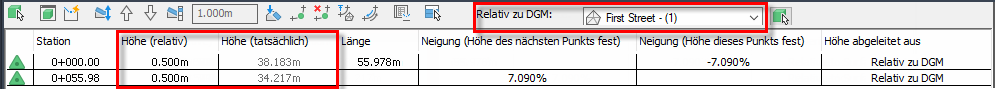 Wird stattdessen das DGM Erste Straße gewählt, werden die Werte aus der Spalte Höhe (relativ) jetzt auf die DGM-Höhen für Erste Straße angewendet, woraus sich die neuen Höhen in der Spalte Höhe (tatsächlich) ergeben.