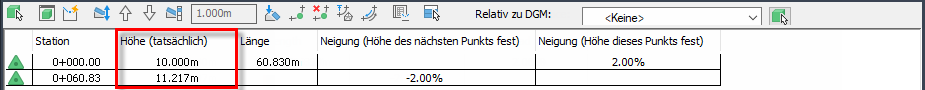 Beispiel: Die folgende Elementkante wurde mit der festen Höhe 10,000 m für den ersten und der Verschneidung 2,00 % für den nächsten Punkt erstellt. Sie ist nicht relativ zu einem DGM.