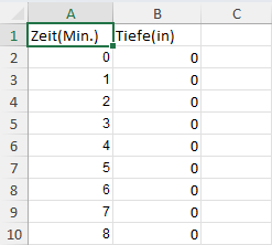 Anmerkung: Es müssen mindestens zwei Einträge mit Minuteninkrement und zugehöriger Niederschlagstiefe in Zoll (oder Millimeter je nach Zeichnungseinheiten) vorhanden sein.