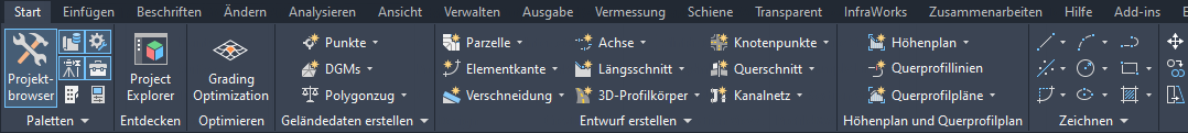 Die Multifunktionsleiste stellt in Autodesk Civil 3D die hauptsächliche Schnittstelle zum Zugriff auf Befehle und Funktionen dar.