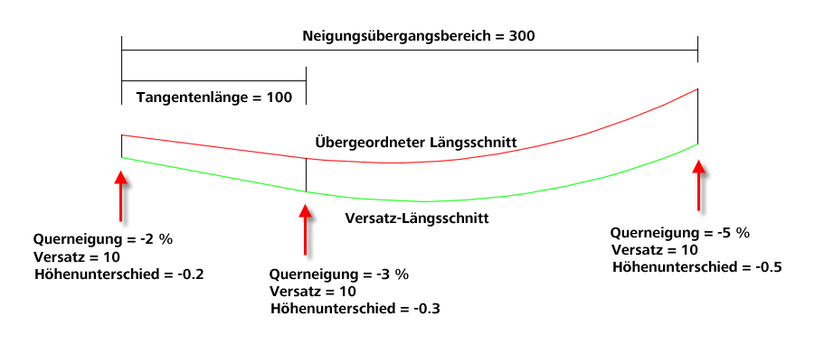 Wird ein Übergangsbereich zwischen zwei Querneigungen angegeben, wird die Geometrie von Versatzlängsschnitten wie im folgenden Beispiel gezeigt erstellt.