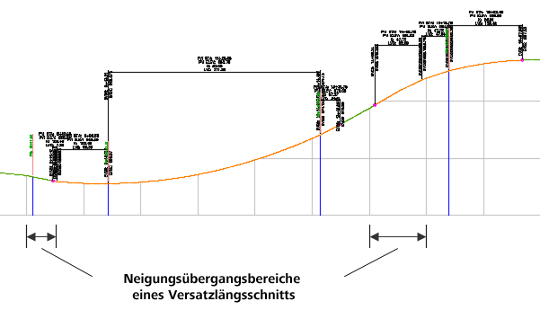 Die folgenden Beispiele zeigen einen Mittellinien-Längsschnitt (oben) und einen Versatzlängsschnitt mit Neigungsübergangsbereichen (unten).