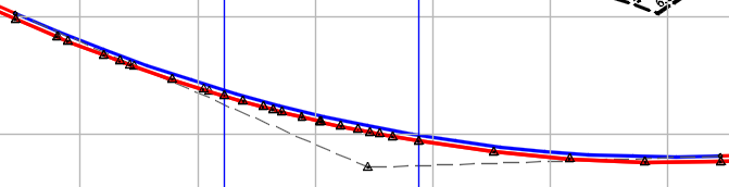 Anmerkung: Bei Längsschnitten, die einem anderen Höhenplan überlagert werden, werden Ausrundungen in der Geometrie von Versatzlängsschnitten tesseliert und dabei in mehrere gerade Segmente zerlegt wie unten gezeigt. Um die Geometrie des Versatzlängsschnitts zu überprüfen und zu bearbeiten, fügen Sie diesen mithilfe des Befehls