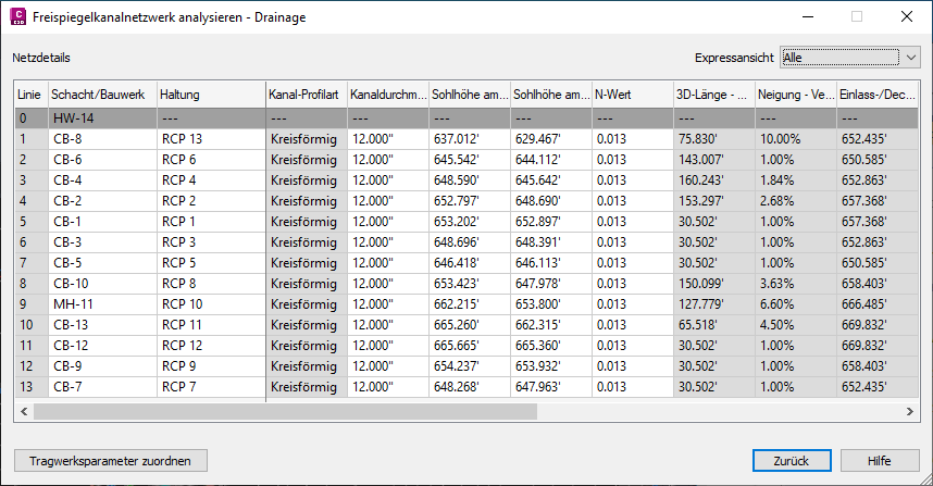 Anmerkung: Der Strukturtyp für mindestens einen Schacht/ein Bauwerk muss Gitterrostzulauf, Straßeneinlauf oder Kombination lauten. Dies definiert den/das Schacht/Bauwerk als einen Zulauf. Diese Eigenschaft kann auch auf der Registerkarte