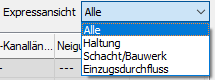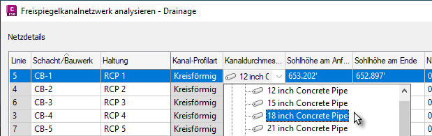 Die verfügbaren Haltungsgrößen in der Kanalnetz-Komponentenliste können aus einer Dropdown-Liste ausgewählt werden.
