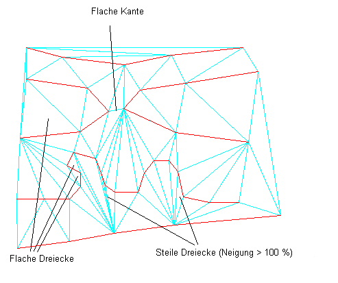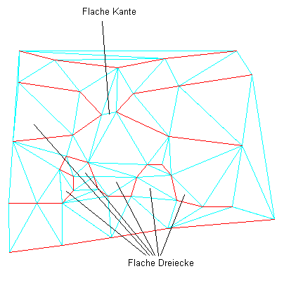 In der folgenden Abbildung wird ein DGM mit flachen Flächen gezeigt, in dem die Dreiecke (in Cyan) eines DGMs aus roten Höhenlinien erstellt wurden. Einige der flachen Dreiecke und Ränder sind gekennzeichnet: