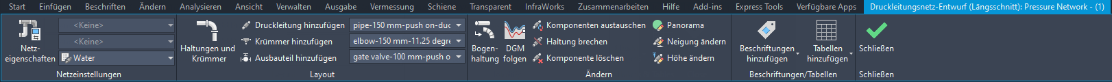Anmerkung: Das Druckleitungsnetz muss im Höhenplan vorhanden sein, bevor Sie auf die Multifunktionsleiste Druckleitungsnetz-Entwurf (Längsschnitt) zugreifen können.