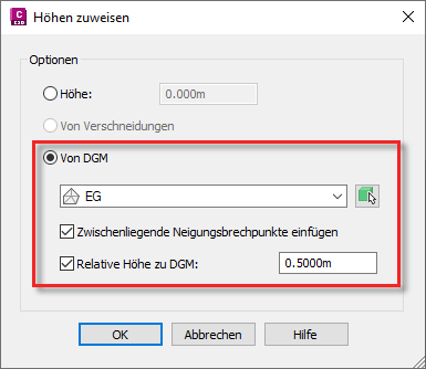 Wählen Sie im Dialogfeld Höhen zuweisen die Option Von DGM.