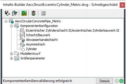 Wenn die parametrische Erstellungsumgebung geöffnet wird, entspricht der oberste Ordner im Komponenten-Browser dem Ordner Komponentenkonfiguration. Bei der Komponentenkonfiguration werden anhand der Domäne (Haltung oder Schacht/Bauwerk), des Typs und des Untertyps die Eigenschaften und das Verhalten der Komponente definiert; die Komponente muss hierfür gespeichert werden. Um sicherzustellen, dass die Komponente ordnungsgemäß validiert und gespeichert werden kann, sollten Sie die Komponentenkonfiguration definieren, bevor Sie mit dem Entwurf der Komponente beginnen.