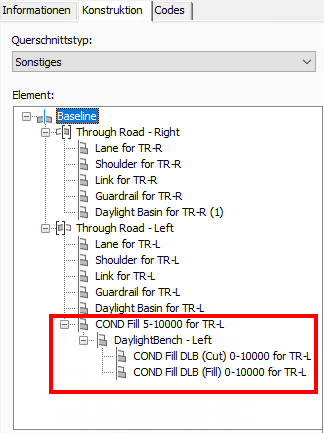 | Mindestabstand | 0.0000’ | Wenn sich die Tiefe des Abtrags oder Auftrags zwischen diesen zwei Werten befindet, werden die nachfolgenden Querschnittbestandteile auf den Querschnitt angewendet. |