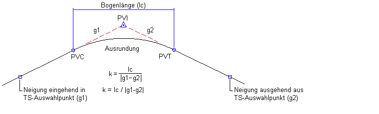 Dieser Wert stellt den horizontalen Abstand dar, entlang dessen eine 1%ige Neigungsänderung in der Ausrundung auftritt. Er drückt die plötzliche Neigungsänderung in einem einzigen Wert aus. Geschwindigkeitstabellen oder andere Entwurfswerkzeuge stellen häufig einen zu erzielenden minimalen K-Wert zur Verfügung.