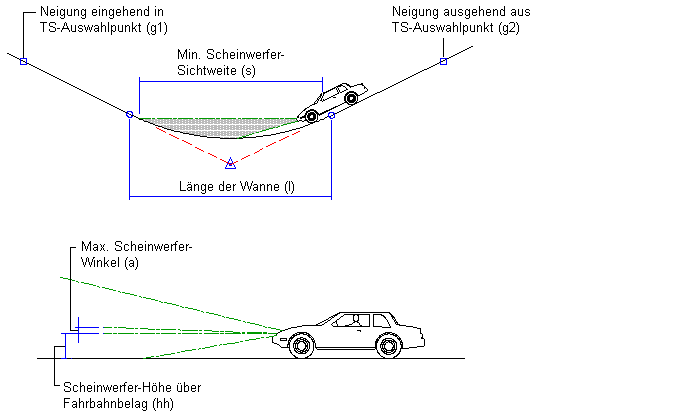 Bei diesem Entwurfsverfahren für Wannen wird eine minimale Bogenlänge zur Verfügung gestellt. Der Bogen muss so lang sein, dass bei Fahrten im Dunkeln die Scheinwerfer eines Standardfahrzeugs die Straße bei der Reisegeschwindigkeit des Entwurfs eine sichere Distanz über die Haltesichtweite hinaus beleuchten.